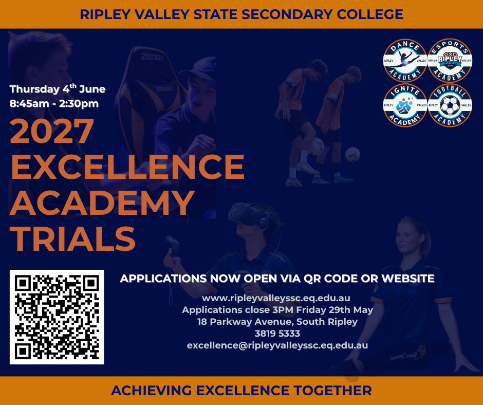 Ripley Valley State Secondary College Excellence Academies are designed to support and foster the development of high achieving students, across different areas, shaping them to be leaders of tomorrow. Through innovative and engaging curriculum design, our various Excellence Academies aims to extend and support students to develop skills and qualifications needed for success beyond the classroom.